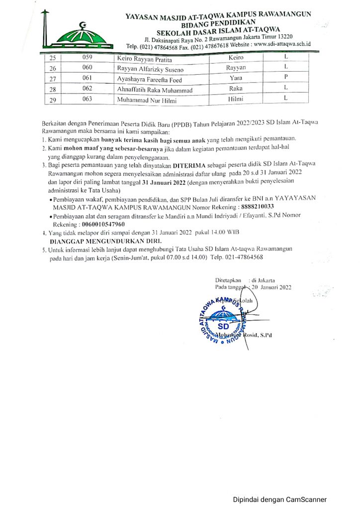 Pengumuman Hasil Kegiatan Pemantauan Peserta Didik Baru Tahun Pelajaran 2022/2023 SD Islam At Taqwa