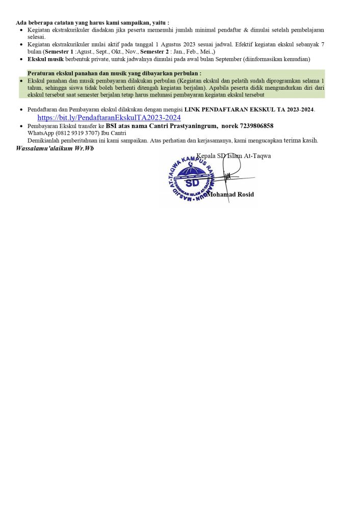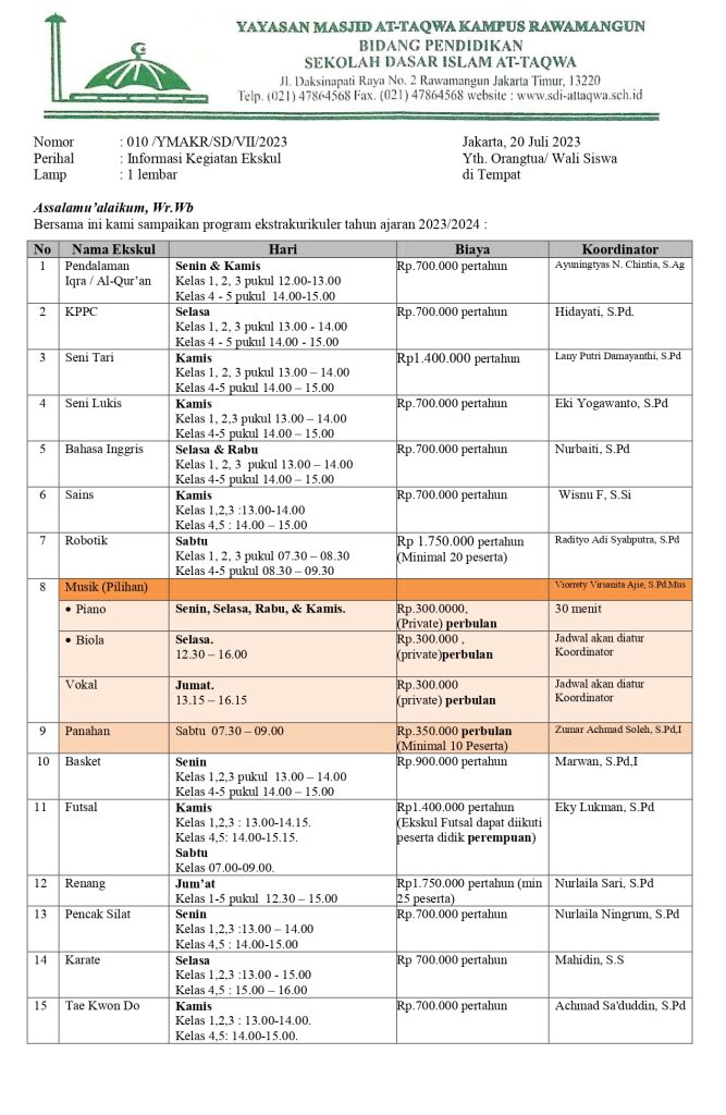 Informasi Masuk Kembali Kegiatan Belajar Mengajar SD Islam At-Taqwa Rawamangun Tahun Ajaran 2025/2026