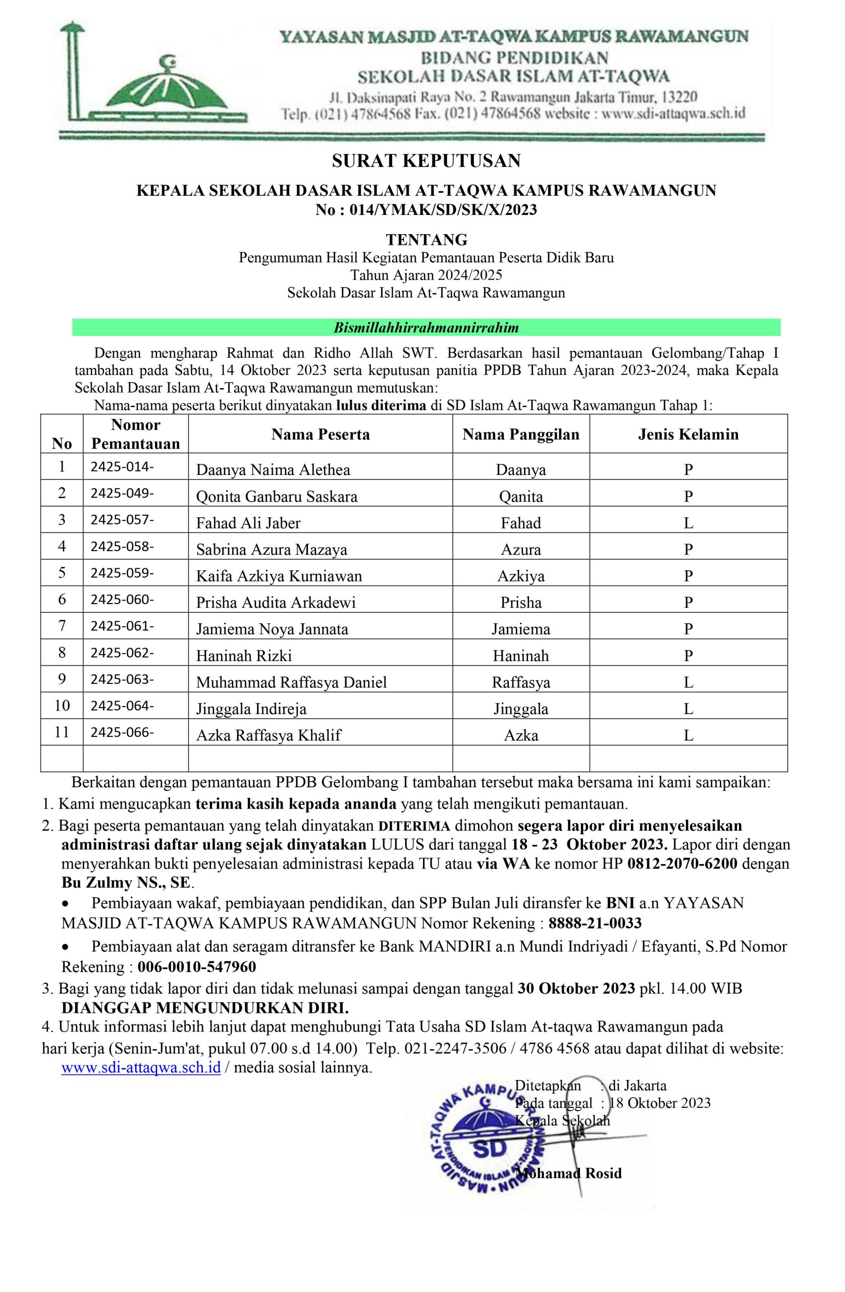 SK PENGUMUMAN SPMB Gel 1 tahap 2 – TA. 26-27, Jumat, 12 Desember 2025